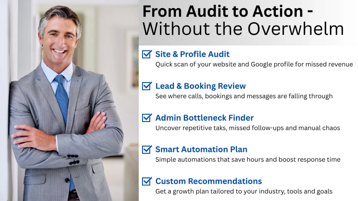 The audit reveals what's draining your time, money and leads. You'll see exactly where to start and how to take control of your business.
